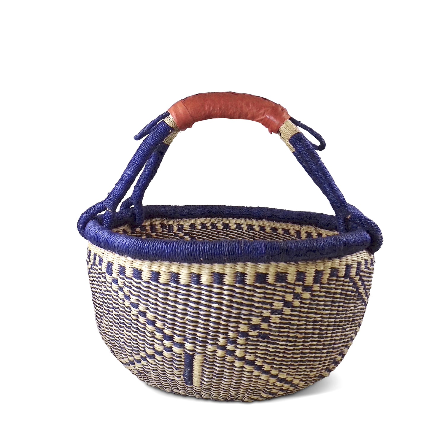 With each order, we ask for certain styles and color combinations: for example, '200 large shopper baskets with gold and indigo and a diamond pattern.' Within those 200, individual weavers may decide to make it an offset diamond or a center one. To add a checkerboard or vertical pattern. To use more gold than indigo. And so on.