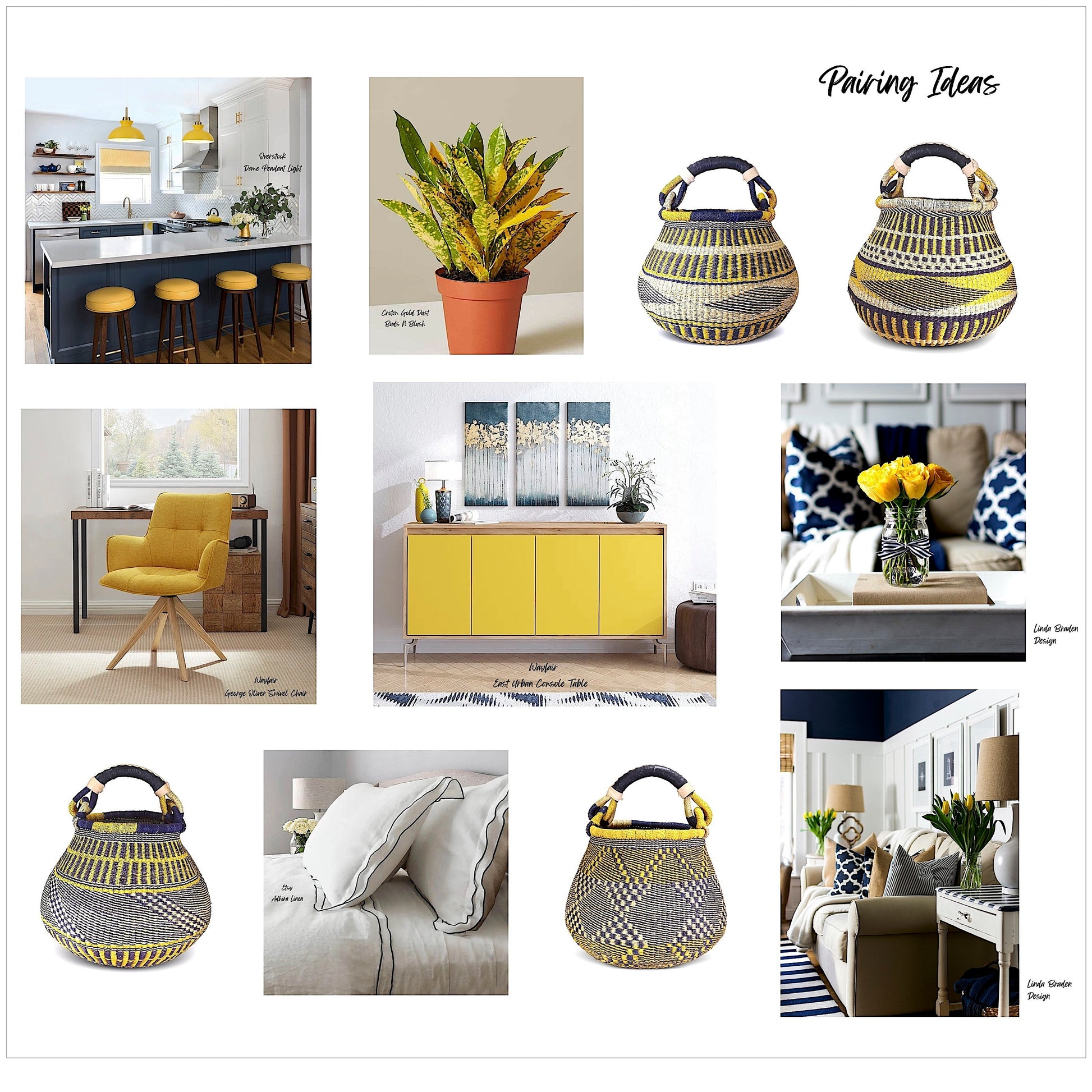 This one shines in any room with navy, white and yellow accents. It's made of sustainable Kinkanhe grass with a leather handle. You'll receive the exact one pictured.