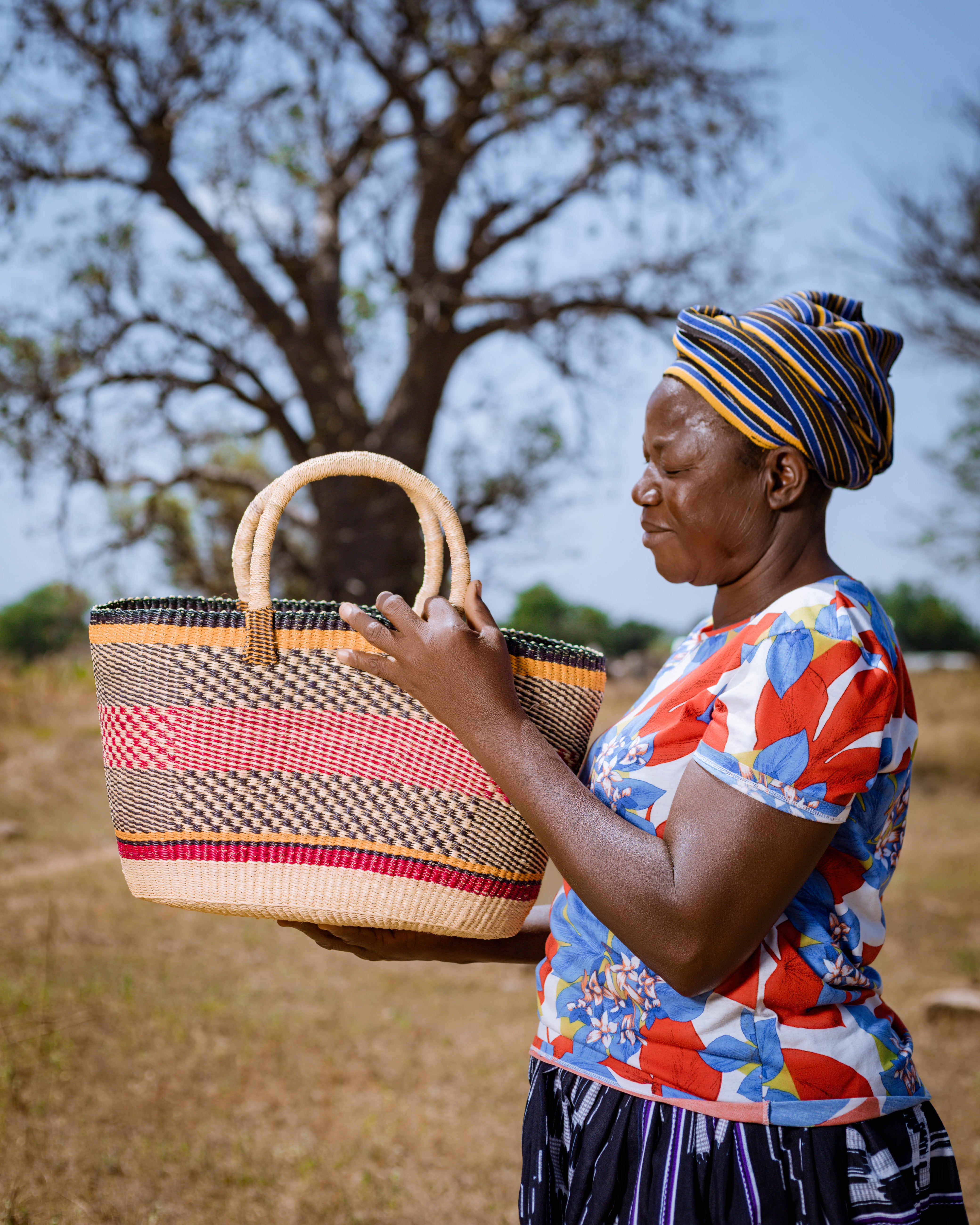 Made of wild grass and leather handles, our tote is sturdy with a flat bottom. It’s joyful, too, the product where we encourage the most creativity among weavers.